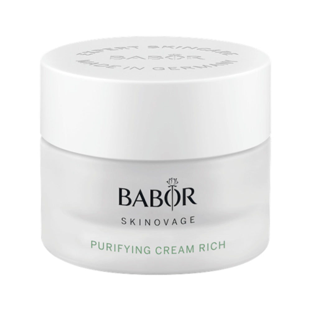 The SKINOVAGE Purifying Cream Rich is specifically formulated for oily skin as it regulates sebum production and reduces excessive oily sheen, leaving the skin looking visibly clearer, more matte and refined.To normalize excessive sebum production, the active ingredient complex relies on natural bioflavonoids from the mulberry plant so that sebum can freely drain away. In addition, the active ingredient optimizes the natural exfoliation process on the skin surface and thus prevents the development of further blemishes. This effect and the additional stimulation of skin regeneration can heal existing pimples as well as irritation faster, and irritation-induced skin aging is prevented.The natural bioflavonoids also help the skin to regulate the natural bacterial flora and keep the skin healthy in the long term. Rice starch in the active ingredient complex helps to visibly mattify the complexion.To avoid drying out the skin too much through sebum control and mattifying effects, important biosaccharides in the SKINOVAGE Purifying Cream Rich have a moisturizing effect, creating a clean, clear and fresh complexion.The SKINOVAGE combines two clever active ingredients to strengthen the skin’s own protective mechanisms and thus ensure the basic requirement for skin health. Alpine rose extract supports, based on the principles of autophagy, the removal of harmful waste products. In addition, it protects the skin from oxidative stress and thus from premature skin aging and helps improve skin elasticity. This is combined with a marine polysaccharide, which strengthens the skin’s protective barrier and makes the skin less reactive and sensitive.