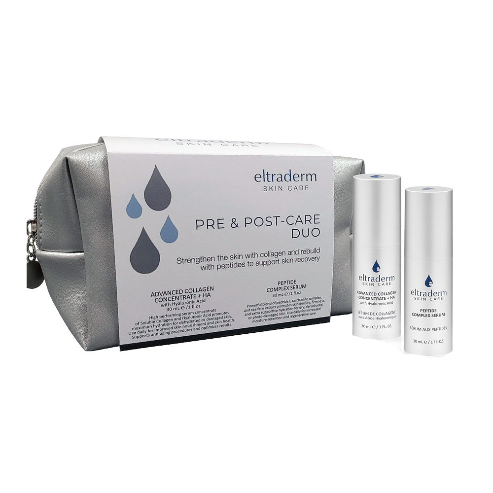 The Eltraderm Pre & Post-Care Duo helps to strengthen the skin with collagen and rebuild with peptides to support skin recovery from procedures.Prepare the skin daily, ideally 2 weeks prior to your treatment, with the Eltraderm Advanced Collagen Concentrate + HA. This high performing serum concentrate of Soluble Collagen and Hyaluronic Acid promotes skin hydration for dehydrated or damaged skin. It supports anti-aging procedures and optimizes treatment results. Use daily for improved skin nourishment and skin health.Upon consultation with your skin care provider, the Advanced Collagen Concentrate + HA may be reintroduced into your skin care routine 24 hours post-procedure. Use morning and evening after gently cleansing the skin.Upon consultation with your skin care provider, 5 to 7 days post-procedure introduce the Eltraderm Peptide Complex Serum into your routine. Our Peptide Complex Serum encompasses a powerful blend of peptides, saccharide complex, and sea fern extract to promote skin density, firmness, and extra supportive hydration which are essential during the skin's recovery process.For increased moisture-retention and regenerative care, use the Peptide Complex Serum daily morning and evening after the Advanced Collagen Concentrate + HA and before any moisturizer.