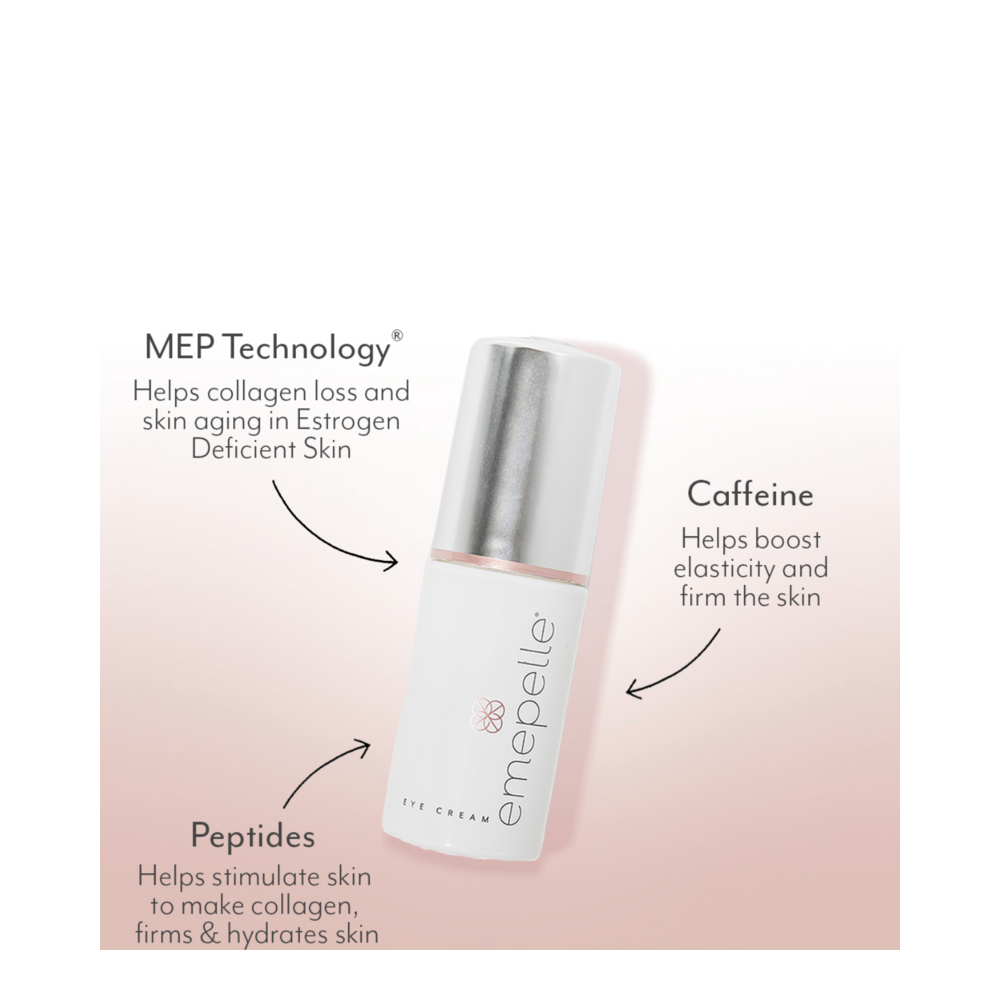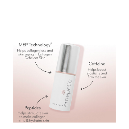 Emepelle Eye Cream is a firming, nourishing, and rejuvenating eye cream that helps reduce the appearance of fine lines and wrinkles, under-eye puffiness, and dark circles for anti-aging benefits and improved luminosity for the eyes. This rich, creamy, and fast-absorbing eye cream features breakthrough MEP Technology to help restore the natural function of Estrogen Deficient Skin, non-hormonally, for improved firmness, hydration, and luminosity. The result is more hydrated and luminous skin. Emepelle Eye Cream is a breakthrough eye cream designed for women in menopause and perimenopause to directly combat signs of estrogen loss and skin aging.