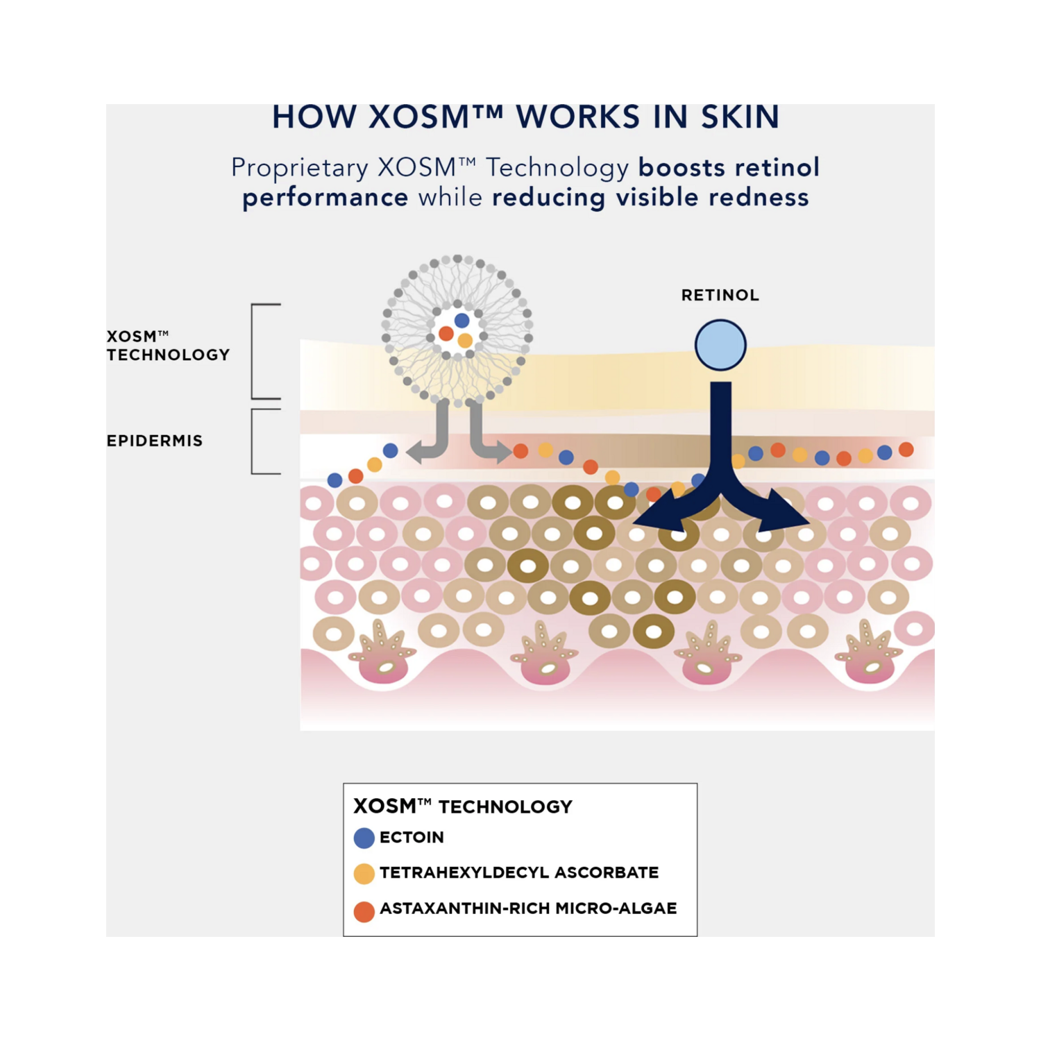 XOSM Technology: Propriety, patent-pending technology that boosts the performance of retinol while protecting and nourishing the skin’s barrier with smart-encapsulated antioxidants ectoin, vitamin C, and astaxanthin-rich micro-algae.